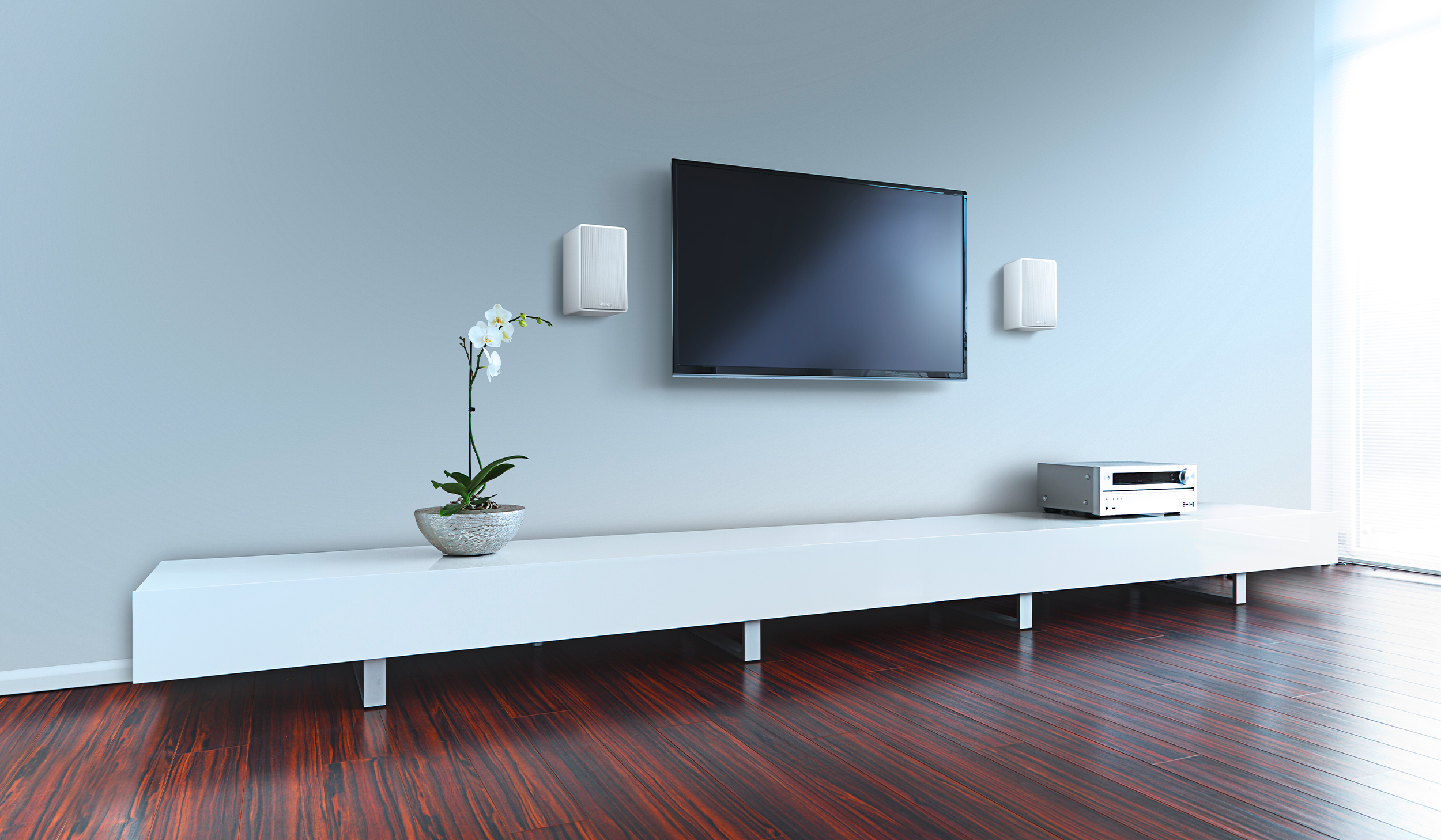 As a plug-and-play stereo speaker, the AM5 enhances music streams and TV playback with dynamic, clear sound. Voices remain present and intelligible, while effects and instruments are reproduced with high detail and spatial separation. Active sound adjustment allows the speaker to be optimally adapted to wall, shelf, or TV placement. The result is versatile 2-way sound that enhances entertainment and music alike.