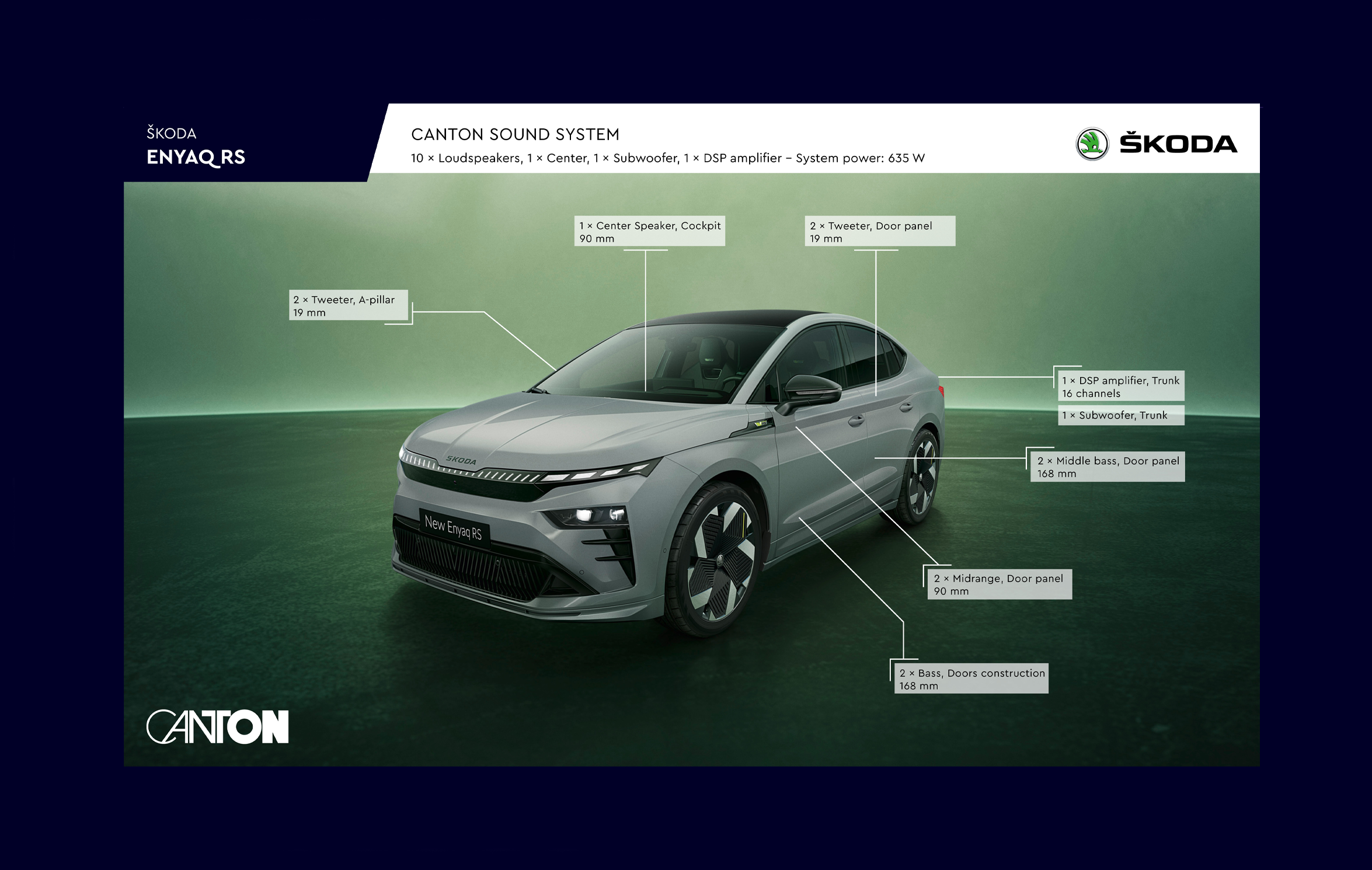 The collaboration between Škoda and Canton began with the goal of enhancing the driving experience with top-class sound. The result of this partnership is a custom-made sound system specifically designed for the demands of the Škoda ENYAQ. By combining Canton's audio expertise with Škoda's vehicle design, a sound system was created that is both functional and aesthetically pleasing.
